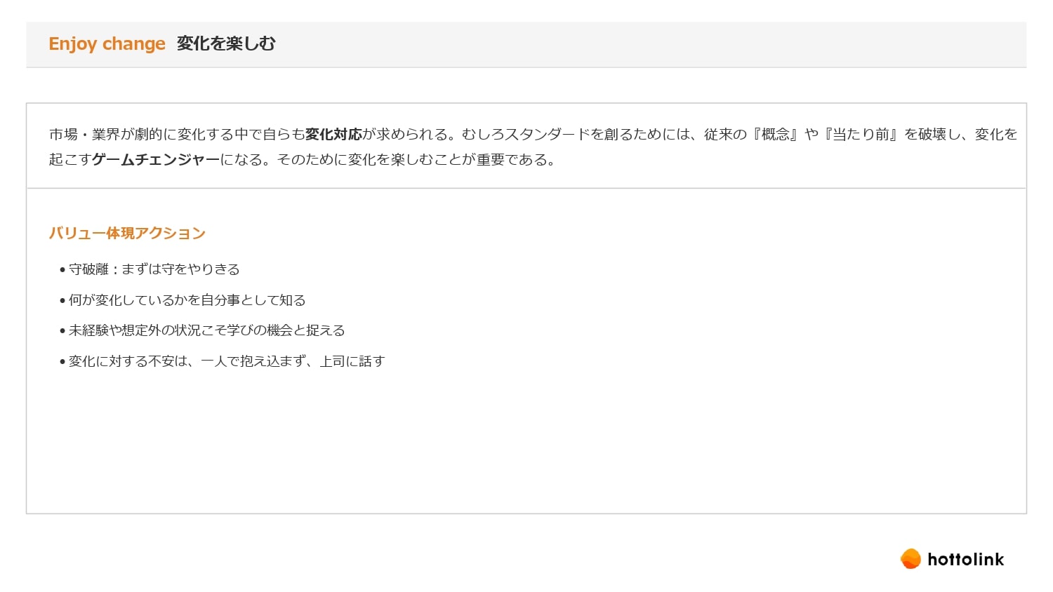 ホットリンクが掲げる5つのバリューのうちのひとつ。市場や業界の劇的な変化に対して柔軟に対応するためには、「変化を楽しむ」姿勢が重要であると定めた行動指針です(画像参照)。