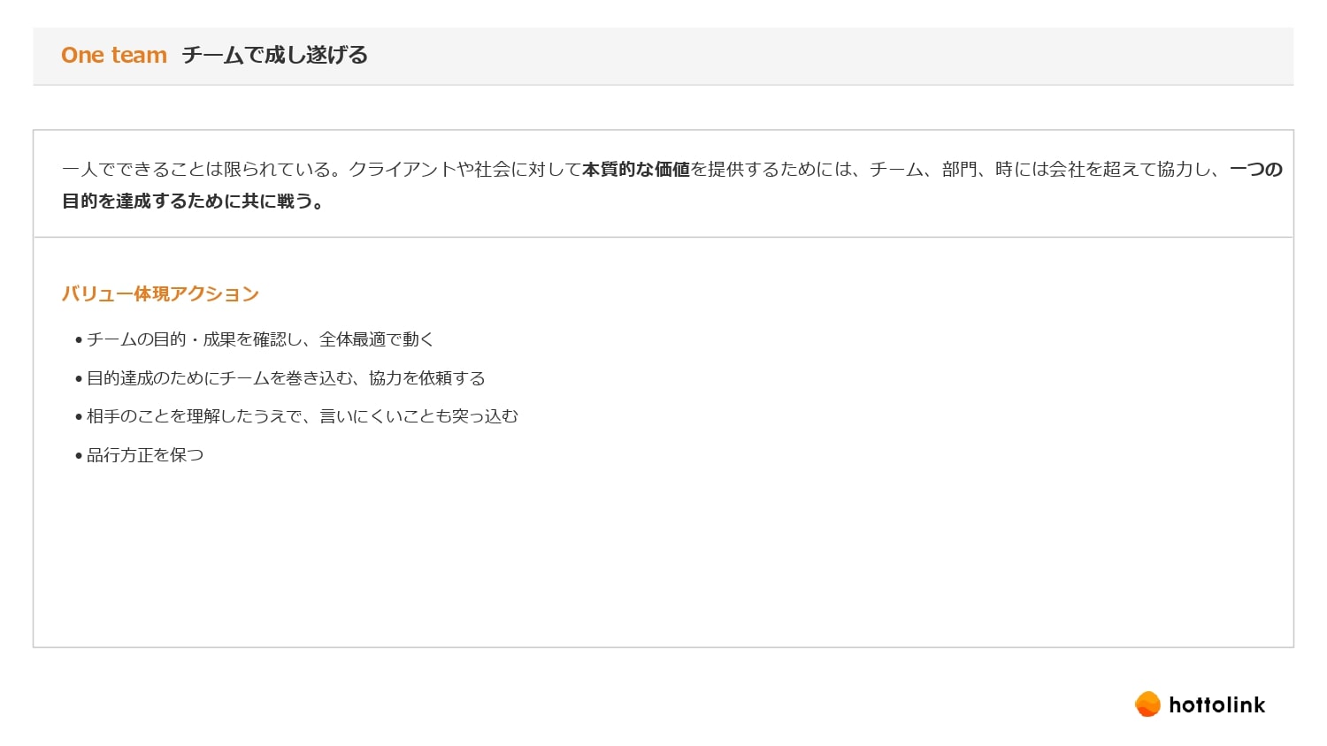 ホットリンクが掲げる5つのバリューのうちのひとつ。「チームで成し遂げる」という意味が込められており、チームや部門、時には会社を超えて協力し合うことで、ひとつの目的を達成し、本質的な価値を提供することを示しています(画像参照)。