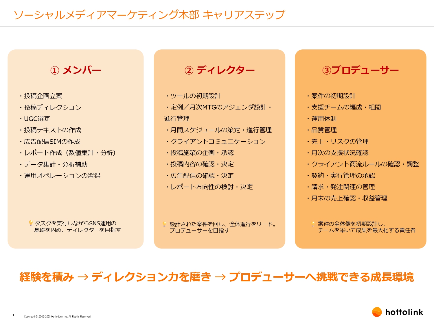 ソシマ部にはメンバー、ディレクター、プロデューサーという3段階のキャリアステップがあり、プロデューサーはお客様の支援や成果に対する全責任を担うポジションです。