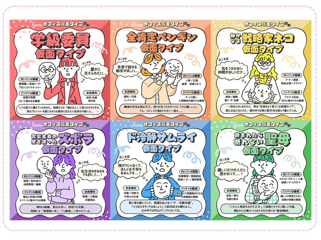 「fasmeオフィス仮面タイプ診断♡」の診断結果は全6タイプあり、あなたの“職場でかぶっている仮面”の特徴や働き方の傾向を解説します。